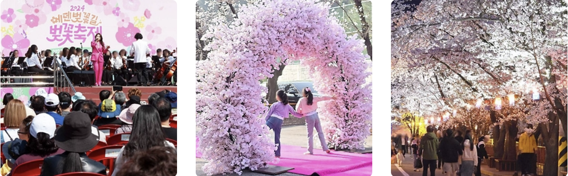 이처럼 다양한 공연과 체험 프로그램은 가평 에덴벚꽃길 축제를 더욱 특별하고 즐겁게 만들어줍니다. 🌞 모든 방문객들이 소중한 추억을 만들 수 있는 이곳에서 뜻깊은 시간을 보내보세요!