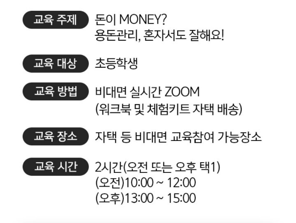 월요일 오후 6시에 신청받고 그 주 토요일에 오전/오후 시간 선택하여 줌(비대면)으로 교육받을 수 있습니다.