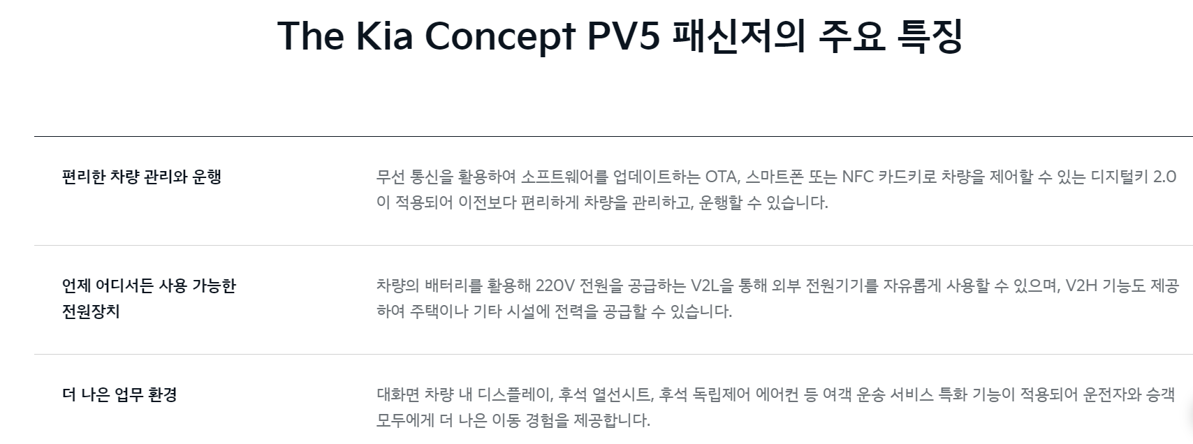 기아의 PV5 패신저 모델은 다음과 같은 특징을 가지고 있습니다: