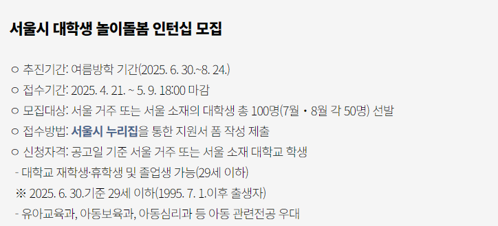대학생 놀이돌봄 인턴십은 서울 거주 또는 서울 소재의 대학교 학생으로, 재학 중인 대학생, 휴학생, 그리고 최근 졸업한 청년(29세 이하)이 지원할 수 있습니다. ⌛️ 또한, 정해진 기간 동안 중복지원이 가능하여, 원하는 활동 기간에 맞춰 참여할 수 있습니다.