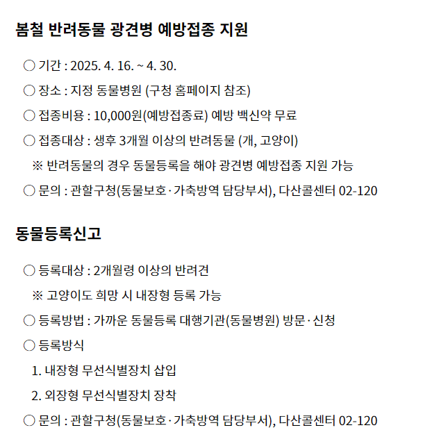이 외에도 문의 사항은 관할 구청의 동물보호·가축방역 담당부서로 연락하거나 다산콜센터에 전화하여 확인할 수 있습니다. 💬