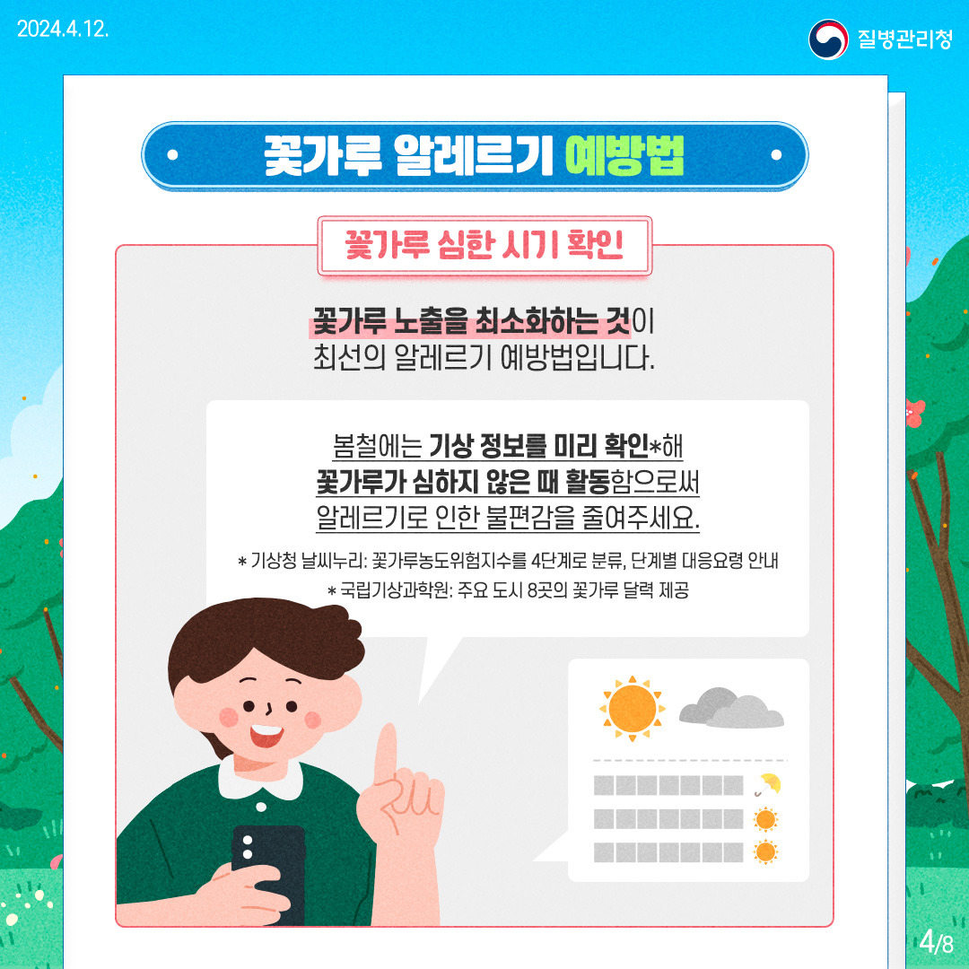 - 오전 시간대에는 꽃가루의 농도가 가장 높습니다. 이 시간대에는 외출을 자제하는 것이 좋습니다.