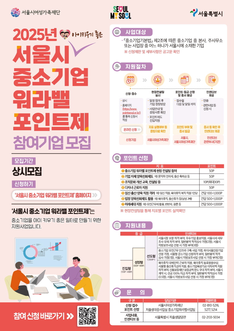 이처럼 서울시는 워라밸 포인트제를 통해 중소기업이 더욱 양육 친화적이며, 직원의 일·생활 균형을 중시하는 방향으로 변화하도록 이끌고 있습니다. 서울시는 앞으로도 이러한 기업을 더욱 지원할 예정입니다.