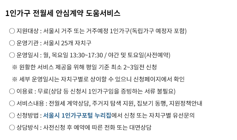 서울시에 거주하거나 거주 예정인 1인가구 여러분! 이제 주거와 관련된 고민을 줄이고, 전문가의 도움을 받아 안전하고 합리적인 계약을 진행하실 수 있습니다. 편리한 서비스 이용을 위해 사전 예약을 잊지 마세요!