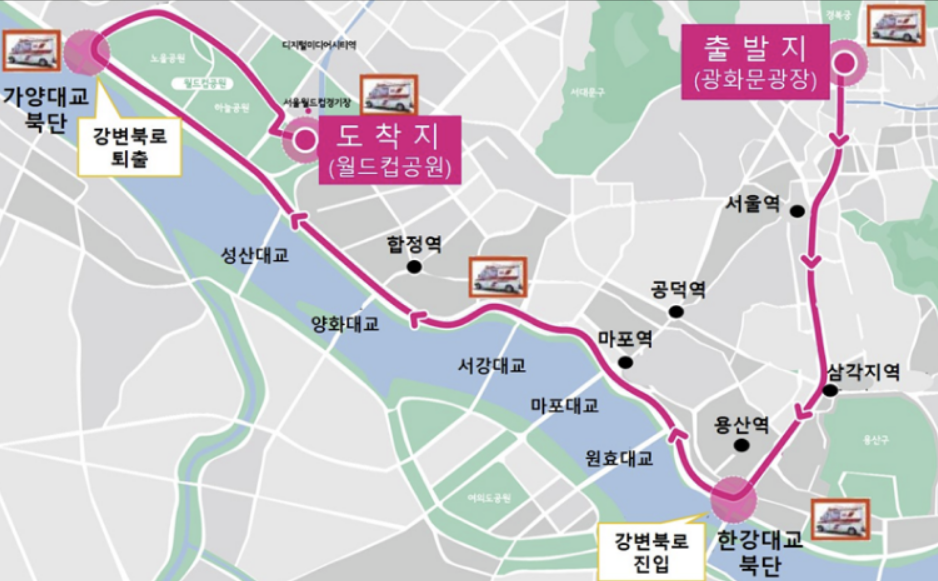 이번 대행진에서는 총 21km의 코스를 평소 자전거로 다닐 수 없었던 도로들을 안전하게 주행할 수 있습니다. 자전거 애호가들이나 가족 단위 참가자들이 편안하게 즐길 수 있도록 구성되어 있습니다. 주요 코스는 다음과 같습니다: