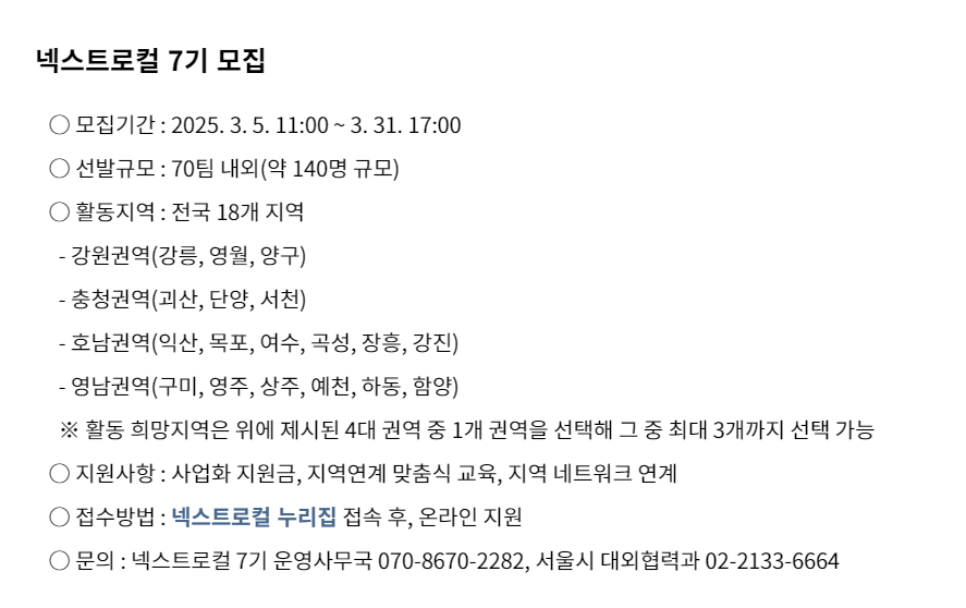 이러한 요건들을 갖춘 청년들은 넥스트로컬 7기를 통해 창업의 꿈을 현실로 만들 수 있는 기회를 접할 수 있습니다! 🚀
