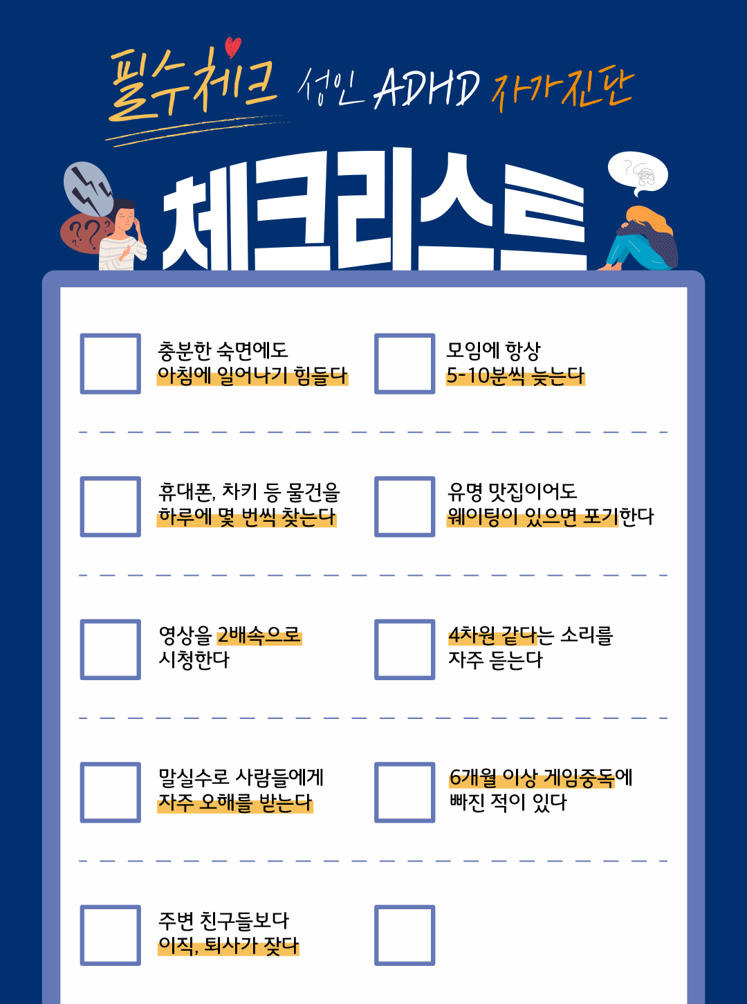 - 결과 평가: 이 질문들 중 4개 이상의 문항에 "예"라고 답했다면, ADHD의 가능성을 의심해 볼 필요가 있습니다.