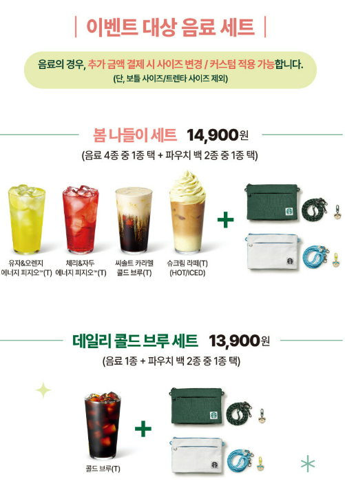 - 가격 정보: 봄나들이 세트는 14,900원이며, 데일리 콜드 브루 세트는 13,900원입니다. 각 음료의 가격은 상이하므로 세트 가격이 달라질 수 있습니다.