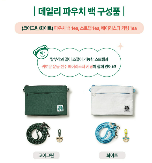 파우치백 세트는 컬러와 디자인이 달라 수집의 즐거움을 더해줍니다. 여기에 포함된 베어리스타 키링은 귀여움과 실용성을 동시에 놓칠 수 없는 요소로, 팬들의 주목을 받을 수밖에 없습니다.
