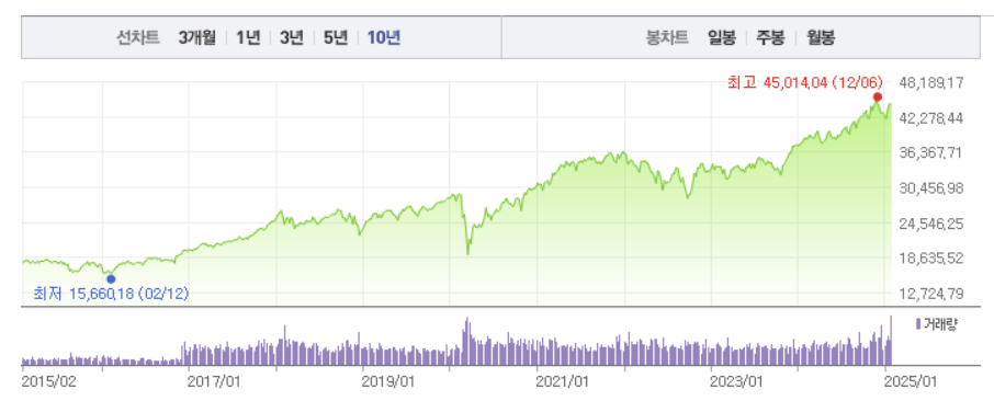 - 다우존스 산업평균지수 (DJIA): 미국을 대표하는 30개 대형 우량 기업의 주가를 반영합니다.