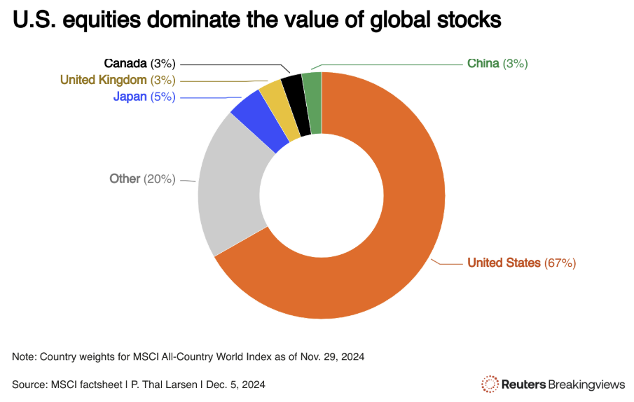 현재 미국 주식시장은 전 세계 시가총액의 약 67%를 차지하고 있습니다. 이는 2001년 이후 가장 높은 수준으로, 미국 기업들의 글로벌 영향력이 얼마나 큰지 보여줍니다.