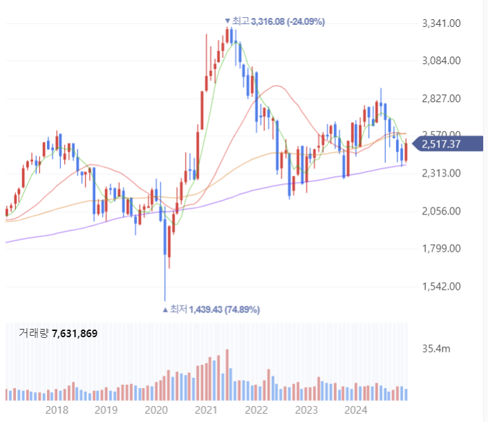 최근 5년간의 지수 추이를 살펴보면, 미국의 S&P 500 지수는 꾸준한 상승세를 보인 반면, 코스피 지수는 상대적으로 완만한 상승세를 나타냈습니다. 예를 들어, 2024년 한 해 동안 S&P 500 지수는 약 24.2% 상승한 반면, 코스피 지수는 18.7% 상승하였습니다.