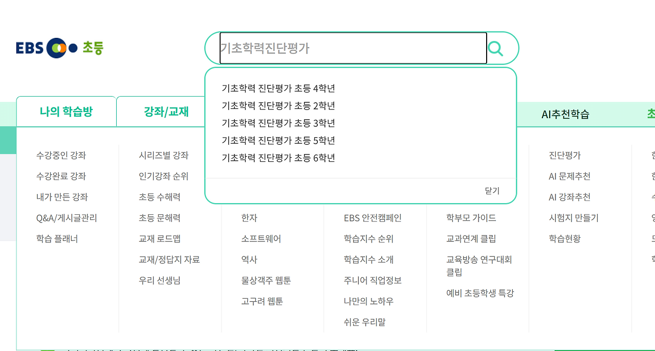 - 검색창에 ‘기초학력 진단평가’를 입력하여 원하는 학년을 선택합니다.