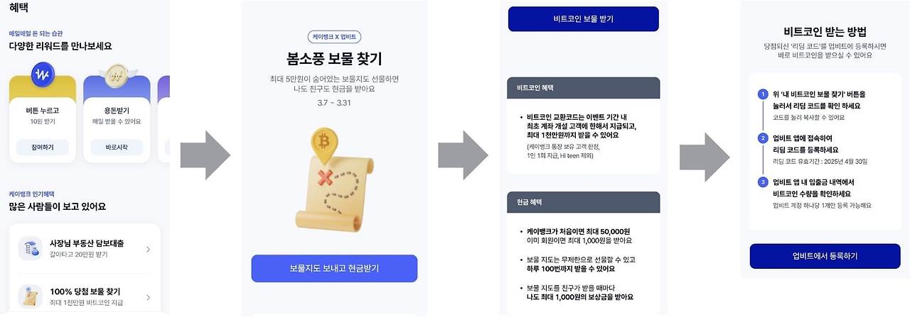 이벤트는 3월 7일부터 3월 31일까지 진행됩니다. 참여 방법은 아주 간단합니다! 케이뱅크 앱에 접속하여 혜택 카테고리에서 '100% 당첨 보물 찾기'를 클릭합니다. 📱