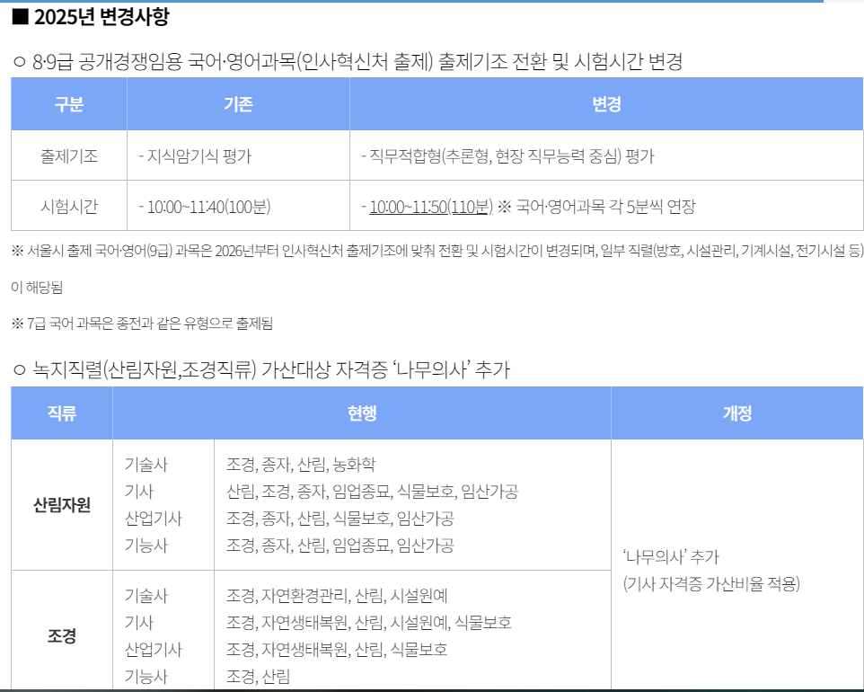 - 녹지직렬(산림자원, 조경) 응시자에게 '나무의사' 자격증이 가산 대상 자격증으로 새롭게 추가되었습니다.