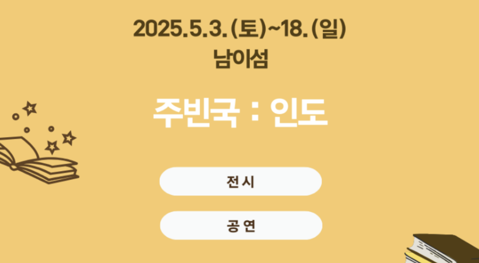 2025년 남이섬 세계책나라축제는 5월 3일부터 5월 18일까지 약 2주간 진행됩니다. 올해의 주빈국은 인도로, 인도의 신화와 문화를 주제로 한 다양한 전시와 체험, 공연들이 남이섬을 가득 채울 예정입니다. 🌏✨