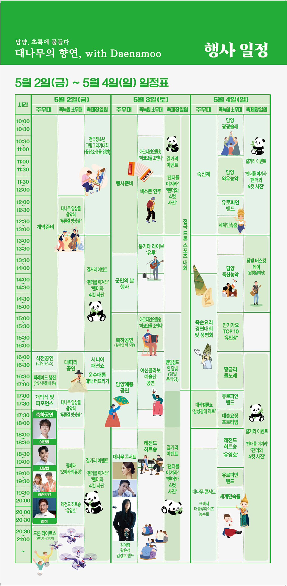 이번 축제의 주제는 '담양 초록에 물들다 - 대나무의 향연 with daenamoo'입니다. 주제와 함께 준비된 다양한 프로그램들은 모든 세대가 함께 즐길 수 있도록 설계되었습니다.