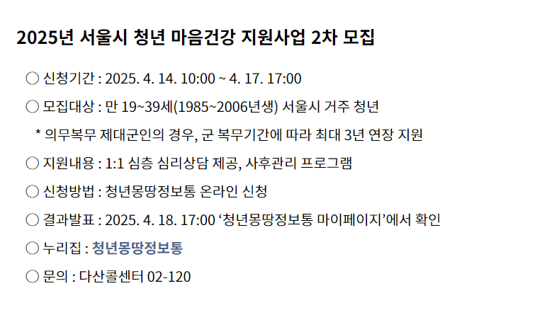 2025년 서울시 청년 마음건강 지원사업의 2차 모집 일정에 대해 자세히 알아보겠습니다. 이번 지원사업은 청년들의 심리적 어려움을 겪고 있는 상황을 이해하고 돕기 위한 정책으로, 많은 청년들이 이용할 수 있도록 다양한 기회가 제공됩니다.