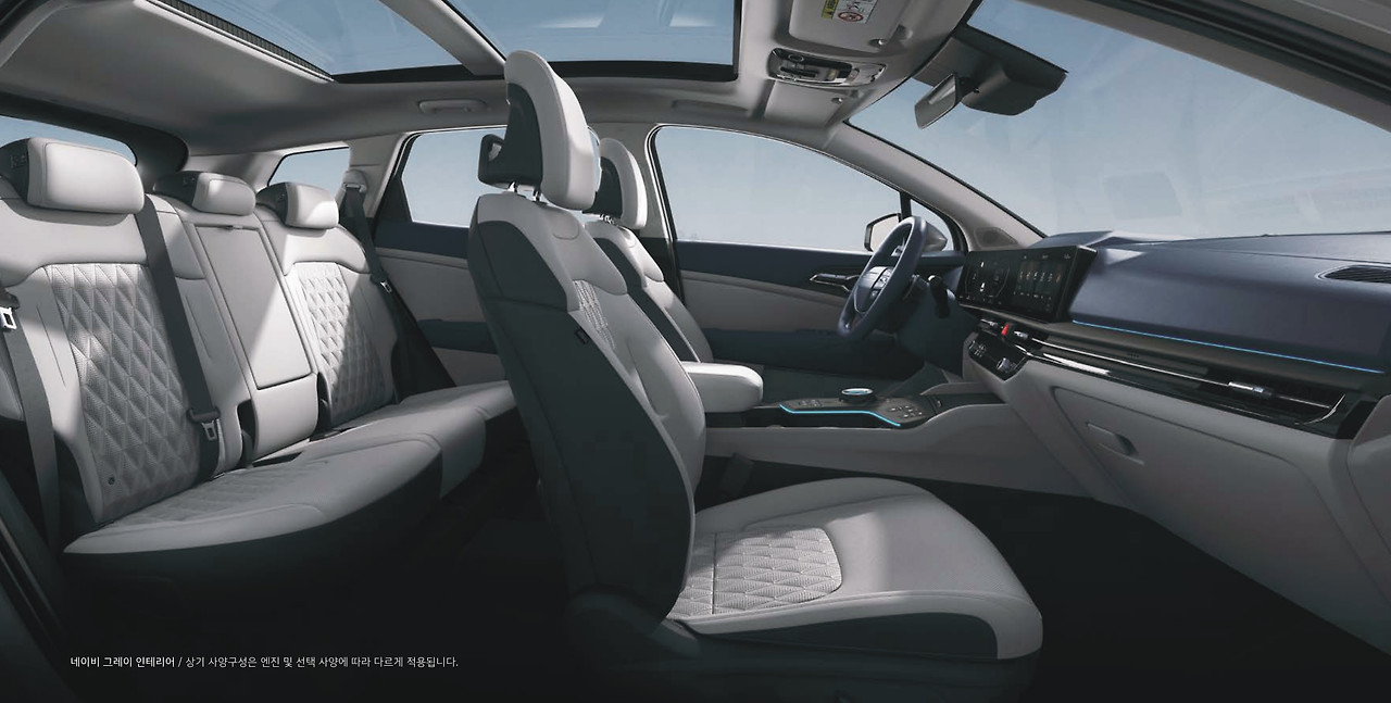 2025 스포티지의 실내는 수평형 레이아웃파노라믹 커브드 디스플레이로 되어 있어 넓고 개방적인 공간감을 제공합니다. 첨단 기술이 조화롭게 배치되어 하이테크한 분위기를 연출합니다. 더블 D컷 스티어링 휠과 무드 조명은 고급스러움을 더욱 강조하고 있으며, X-line 트림의 블랙 스웨이드 헤드라이닝 및 프리미엄 스티어링 휠은 특별한 분위기를 제공합니다. 🎛️✨